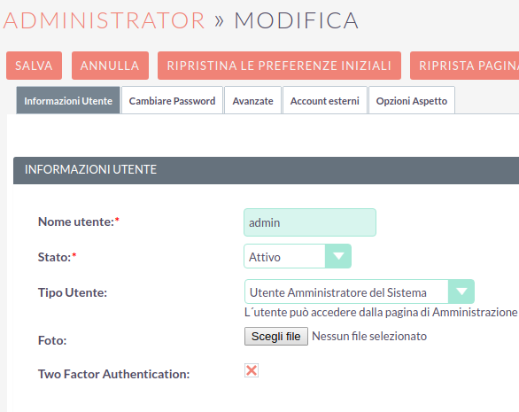 L’autenticazione a due fattori deve essere attivata per ogni singolo utente dalla pagina del profilo