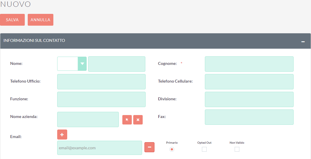 Cliccando sul pulsante di creazione di una delle qualunque aree verremo reindirizzati alla schermata di creazione dove potremo inserire i dati per il record del modulo scelto.