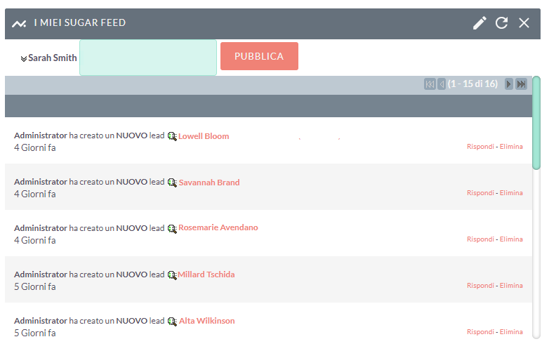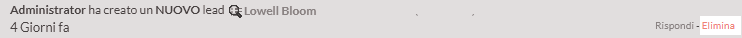 Il flusso di attività è anche uno strumento utile per la messaggistica interna. E’ infatti possibile inviare un messaggio a tutti gli utenti digitando il messaggio nel campo di testo e facendo click su Post. Gli altri utenti vedranno il messaggio e saranno in grado di rispondere facendo clicl sul pulsante Rispondi. La loro risposta apparirà sotto il post.