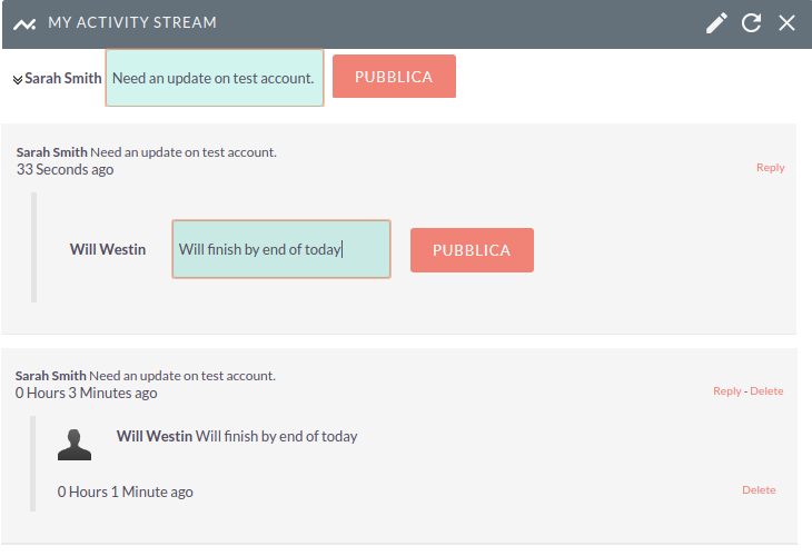 E’ possibile commentare un aggiornamento all’interno del flusso di attività cliccando sul pulsante Rispondi sul lato destro del post. Il commento apparirà sotto il post originale.
