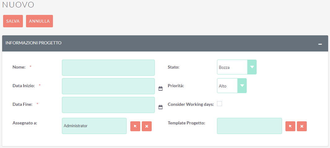 A questo punto fare cliccare su “Salva” per creare il progetto oppure cliccare su “Annulla” per uscire dalla schermata del progetto senza salvarlo.