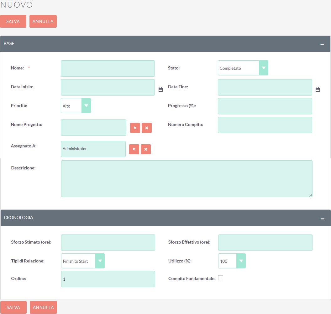 Infine cliccare su “Salva” per creare il compito di progetto oppure cliccare su “Annulla” per tornare alla DetailView del progetto senza creare il compito di progetto.