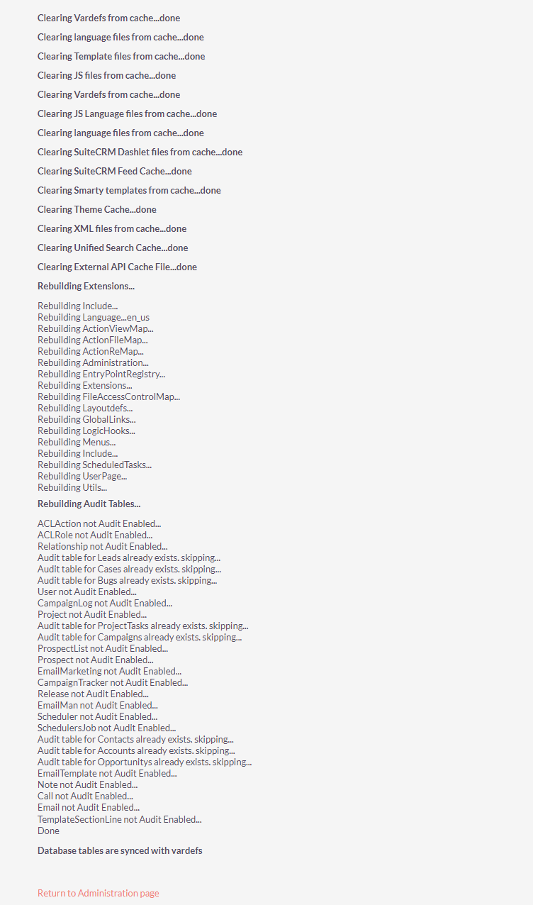 Durante il processo, SuiteCrm visualizzerà un registro attività in tempo reale in modo da poter monitorare il suo progresso. La riparazione richiederà circa un minuto. Una volta completata il registro visualizzerà una riga finale con scritto “Done” e subito sotto “Return to Administration page”, un link alla pagina d’Amministrazione.