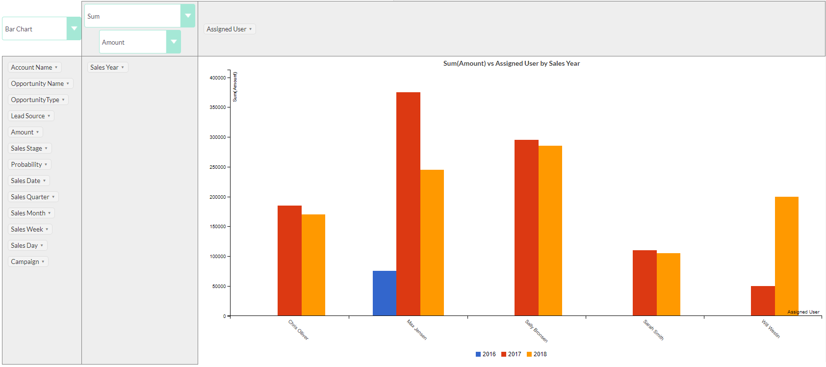 2) selezionare “Sales Year” come asse delle ordinate (y) e “Assigned User” come asse delle ascisse (x);