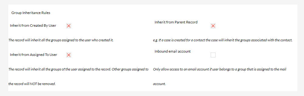 Nella sezione “Group Inheritance Rules” (Regole di ereditarietà di gruppo), i valori predefiniti di “Inherit from Created By User”, “Inherit From Assigned To User” e “Inherit from Parent Record” funzioneranno perfettamente in questo scenario.